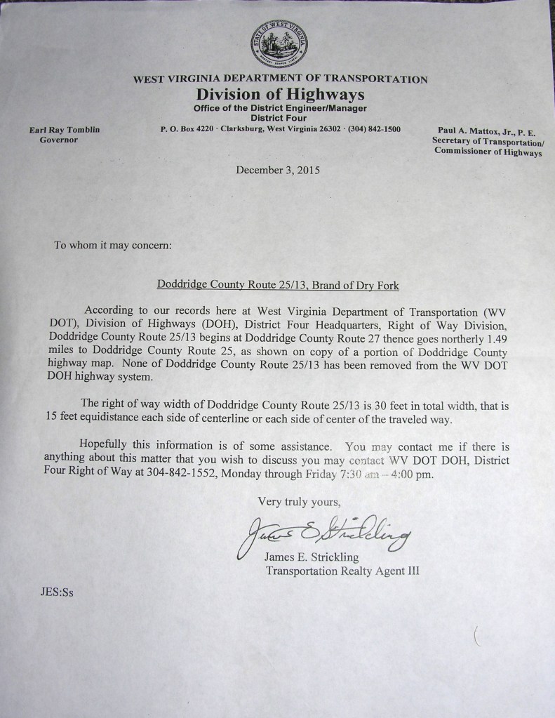 He warned them, “The road leading to our farm is a narrow one lane road with sharp turns and curves. I keep the road ditched and my son trims the grass and trees along this narrow road. We own the land on both sides of the road mostly. It is a gravel road coming to our house from the Meathouse Fork Road. There is no way trucks and large equipment can travel this road.”